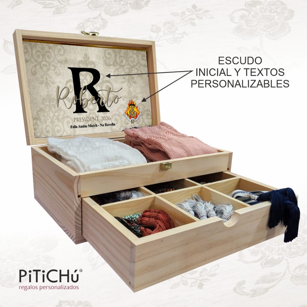 Caja para Calcetins i Lligacames con Inicial, textos y escudo PERSONALIZABLE