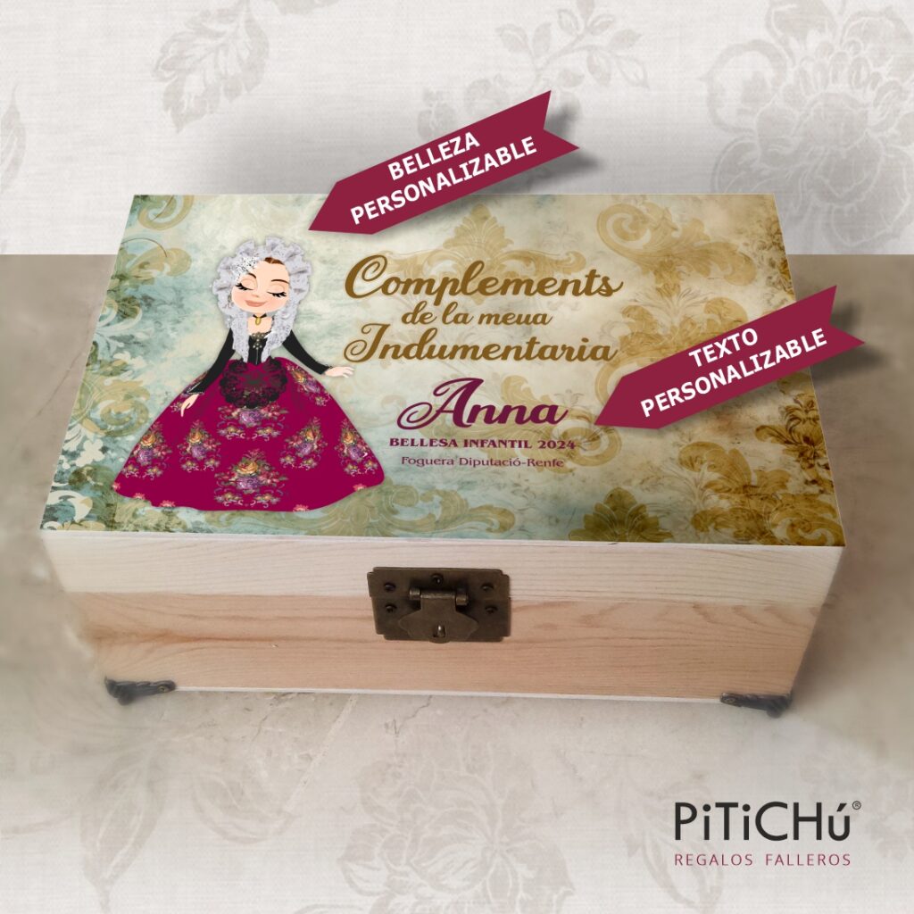 Una de las características más destacadas es la posibilidad de personalización. Puedes personalizarla con el nombre, cargo, año, nombre de la Hoguera, convirtiéndola en un regalo verdaderamente especial. Además, cuenta con una preciosa ilustración de nuestra belleza que también puedes personalizar como el color del traje, color de los ojos, color del pelo… etc.