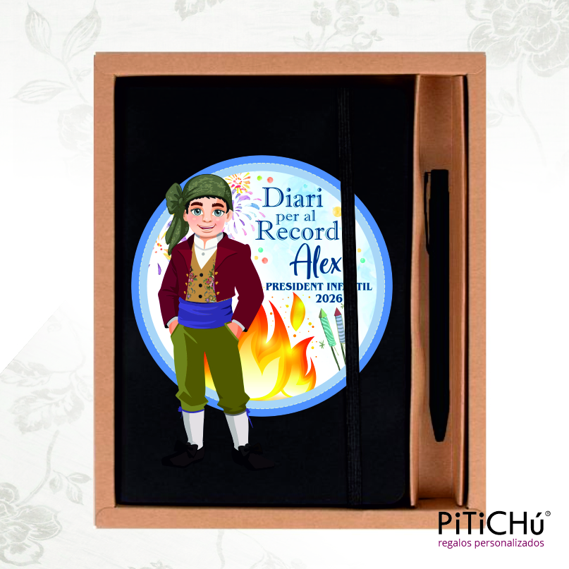 Conjunto de Diario con tapas duras Personalizables con Nombre, Cargo, Año y nombre de la falla. Con bolígrafo a juego, en color negro, presentado en caja de cartón kraft.