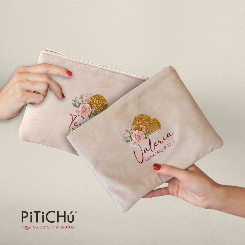 Neceser Personalizable, fabricado en tejido de terciopelo con tirador y cremallera dorada. Su interior es mullido, ligeramente acolchado.